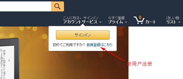 1、首先打开日本亚马逊首页,在页面右上角方向找到注册的地方 “新規登録はこちら”点击。如图: